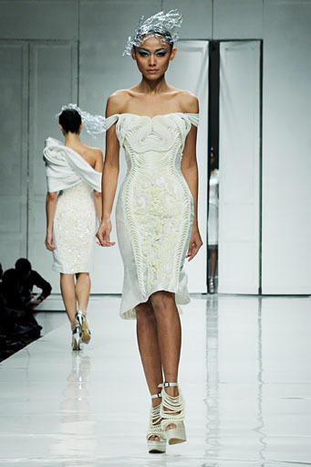 The show started with a range of white dresses and grey coats in all forms, from a strapless knee-length gown, to a mermaid flared gown with white beadings, a shoulder strap gown with beads fringes, to feathered grey coats, printed grey coats, and laser cut dresses, to sheer white coat on top of structural one shoulder dresses. All the looks were form fitting but edged up with a structural form on some part of the design giving the whole looks to be fashion forward, chic, and oozes sex appeal, not something for the conservative type of women. The looks were also accentuate by dramatic make ups of blue and silver eye shadows, pulled up hair dos, and tanned skin, all the models wore a strappy platform heels in an array of colors from black to white, and silver which are dramatized with glass tear drops headpieces. It was couture in all aspects! The dramatic headpieces, to the dramatic accessories and make ups, and an undeniably outstanding craftsmanship and application of different techniques in all the dresses, it was a statement for fine sartorialism of Didi Budiardjo, and we eager for more. One look that captured us in raptures was a grey coat made entirely out of feathers assembled in forms of leaves, it was a coat to die for.